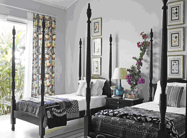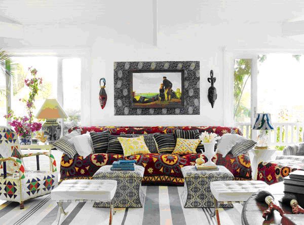 Utiliza en su decoración objetos refinados, pero aún así logra concebir espacios que transmitan tranquilidad y confort. En el salón, sobre la mesa de madera, coloca un cabeza de Buda al lado de un busto romano y de un vaso de cerámica china. Cuadros vintage comprados en los innumerables viajes del arquitecto, aparecen colgados por varios ambientes, muchos traídos de Taiti y Cuba. Los sillones, otomanos, mesas y sillas diseñadas por el propio arquitecto con piezas de diferentes orígenes: Kenia, Uzberkistao, Bali y EEUU terminan por componer el espacio. En la otra parte del salón, máscaras kenianas, pinturas del siglo XIX, sillones con patrones claramente africanos provenientes de Nigeria son combinados con los bancos vanguardistas de cuero blanco del arquitecto Mies van der Rohe. En el cuarto de visitas utiliza camas antiguas provenientes de Bali cubiertas con quilt.