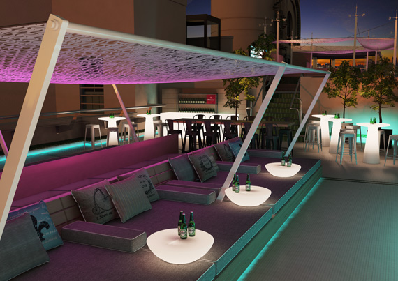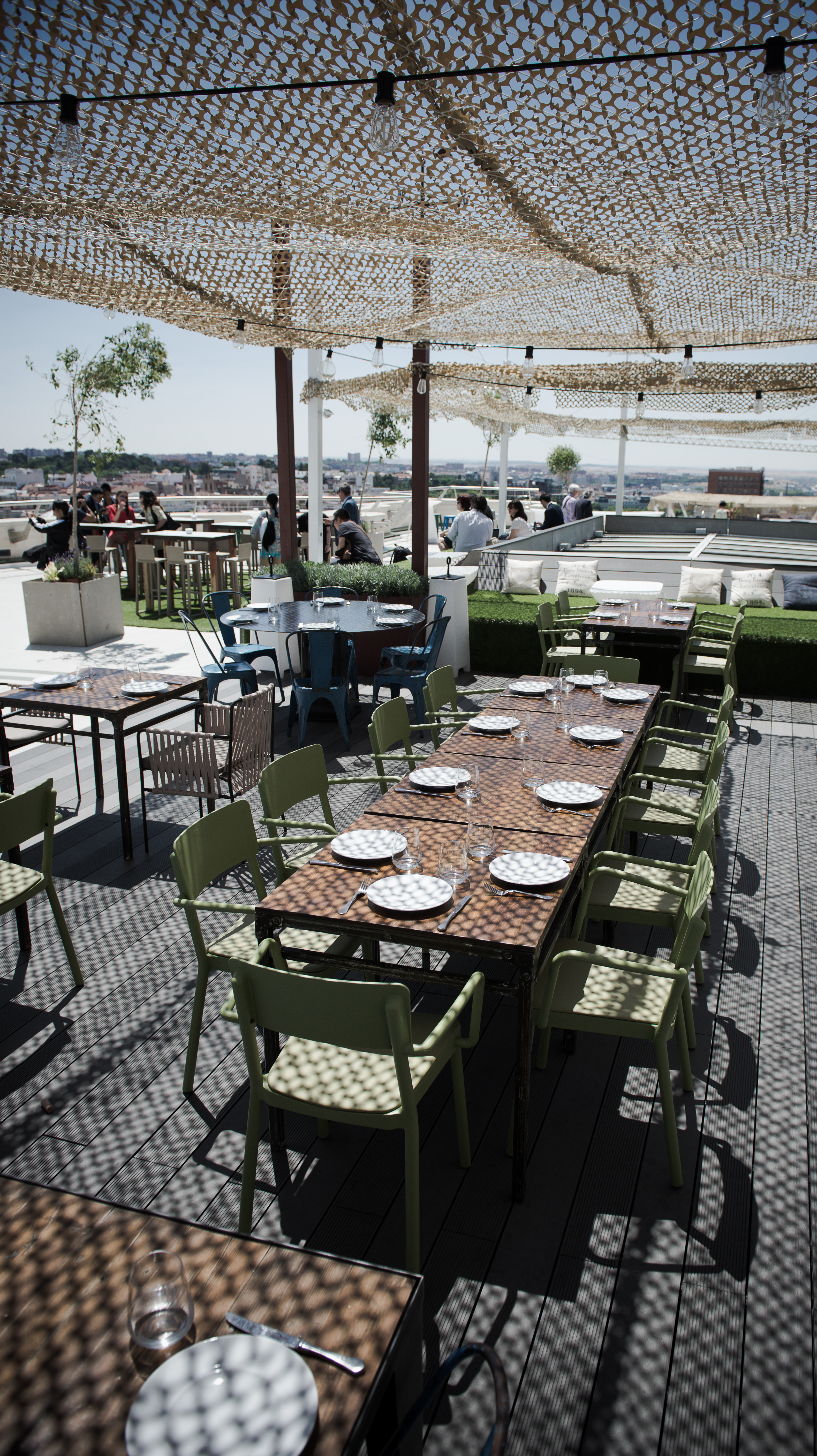 La selección de muebles y la configuración del espacio está pensada para que el visitante siempre esté mirando y disfrutando de las vistas de la ciudad. A tal fin han dispuesto gran parte del mobiliario sobre decks de madera de diferentes alturas para que el usuario siempre esté con la mirada por encima de la altura de la barandilla de la azotea. Piezas de diseños, de aire vintage e industrial, como la silla Tolix, el sillon Nido de Expormin, el sillón Lisboa de Resol y los faroles y mesas iluminadas de Vondom combinados con pérgolas cubiertas con mallas perforadas de color arena que funcionan como parasoles, contribuyen al disfrute visual del espacio.
