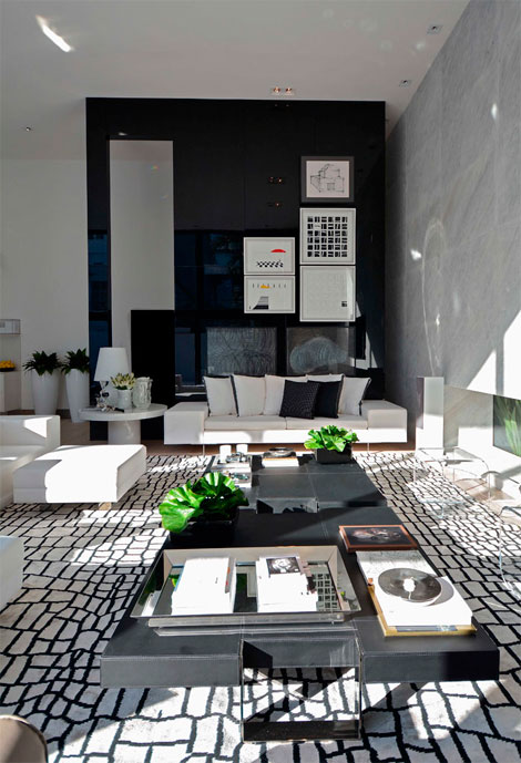 Lidia Maciel en su espacio BW House apuesta por el blanco y negro. Un ambiente que también llama la atención por su doble altura de 5 metros, el revestimiento de mármol blanco en la pared de la chimenea y las fotografías de los artistas Raphael Macek y Wesley.