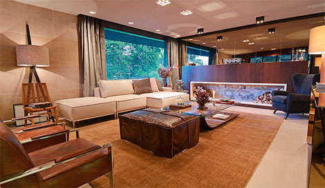 Setenta living de Ana Hanszel y Marcelo Polido se han inspirado en la simplicidad geométrica del diseño nacional de los años 70. Líneas rectas, muebles de diseño como la butaca Bob, madera de imbuía miel, cuero envejecido y espejo configuran un espacio de colores sobrios y sofisticados pero al mismo tiempo muy acogedor.