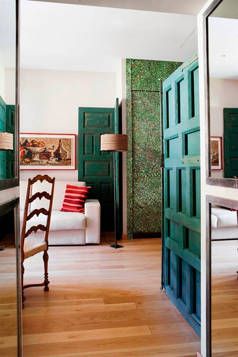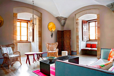 Los espacios comunes del Monasterio, como salón, biblioteca, recepción, sala de desayunos y restaurante fueron diseñados en conjunto por los cuatro decoradores. En cambio, el diseño de las habitaciones lleva la firma por separado de cada decorador. Abajo suite diseñada por Pepe Leal.