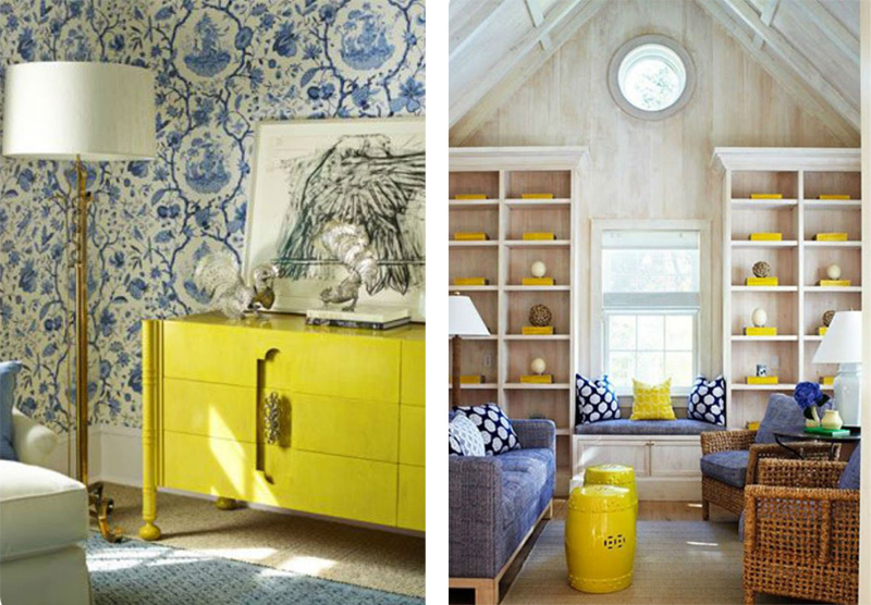 Quizás por comodidad, tenemos la tendencia de repetir determinadas asociaciones cromáticas. Este es el caso del azul, que siempre lo asociamos con el blanco. Por favor, da rienda suelta a tu imaginación y sabor a tu decoración. No dejes de probar nuevas combinaciones como éstas dónde se contrasta el color cálido amarillo con el frío azul Klein. Colores opuestos que en la dosis correcta producen efectos y sensaciones sorprendentes. El amarillo aportará calidez, luz y alegría mientras que el azul elegancia, seriedad y tranquilidad. En estos casos, podemos resaltar cualquiera de los dos colores ó convertir uno en protagonista.