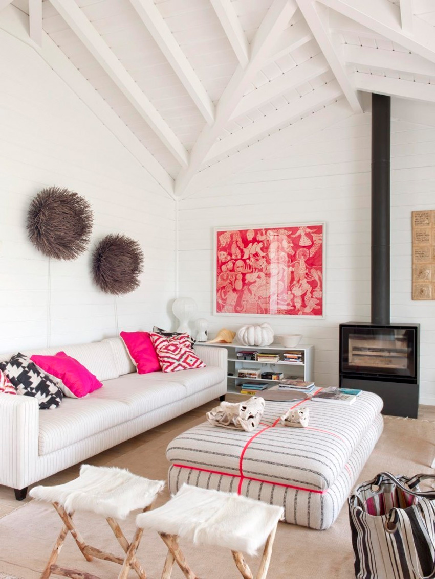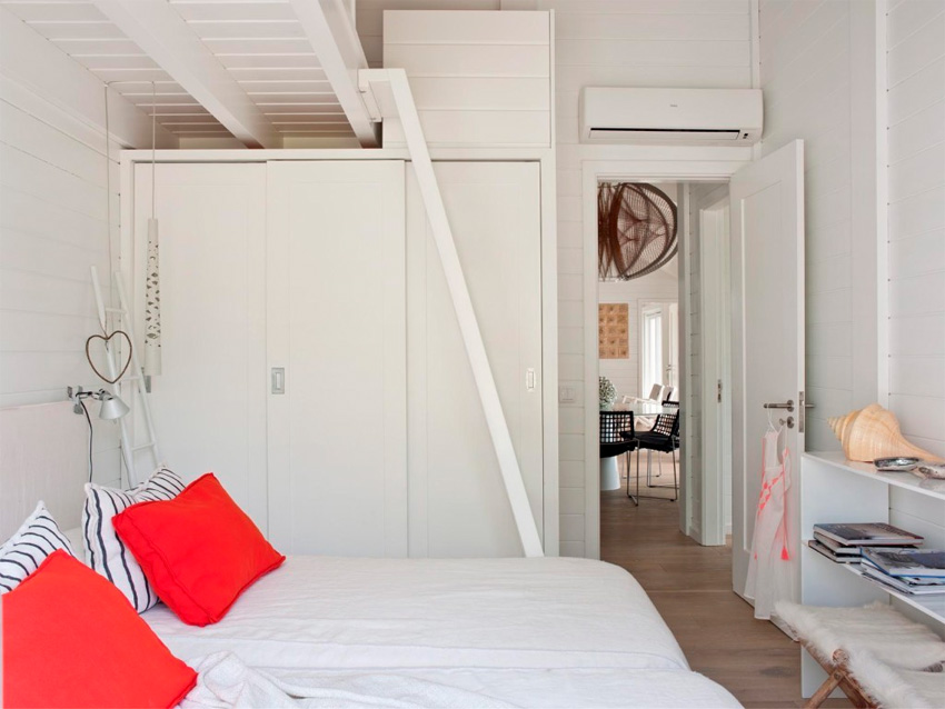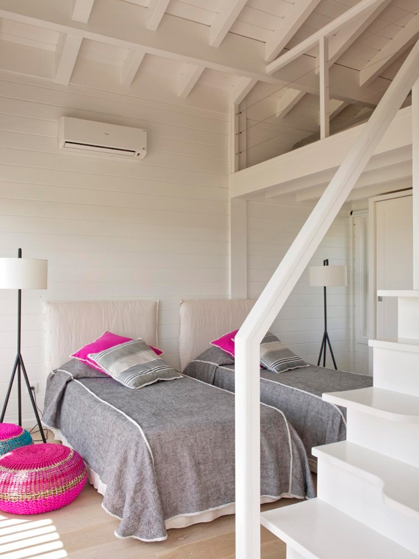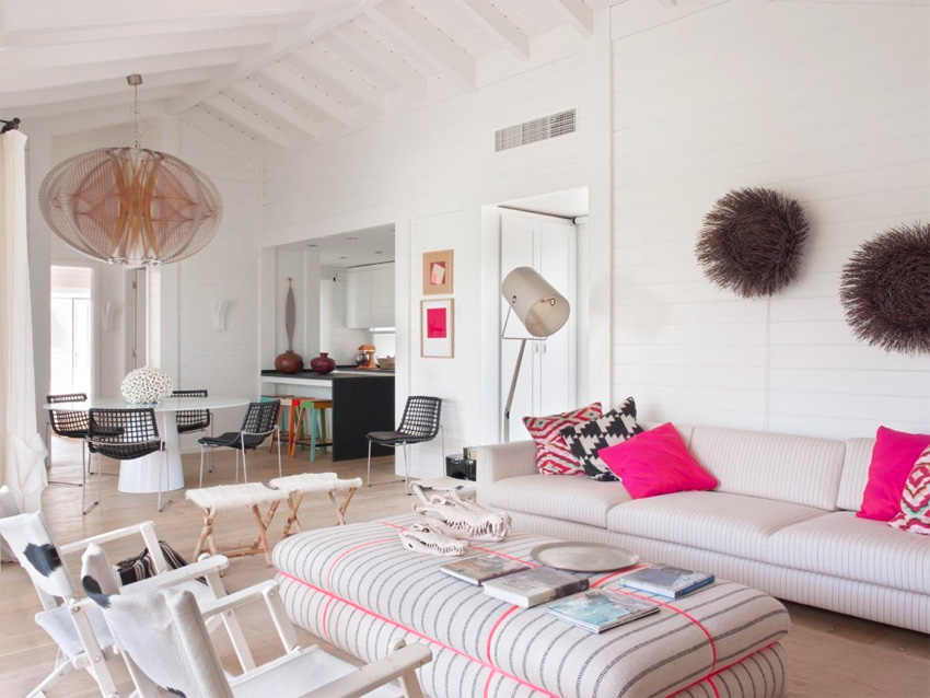 En el interior, la decoración quiere de cierto modo romper con el tradicional esquema cromático «azul marinero» de las casas de playa. Aquí las interioristas apuestan por una paleta de colores neutros contrastado con colores fuertes, como el atrevido rojo y fuscia. Estos colores funcionan muy bien, cuándo los aplicamos en pequeños detalles, de este modo damos personalidad al ambiente pero no restamos amplitud y luminosidad al espacio.