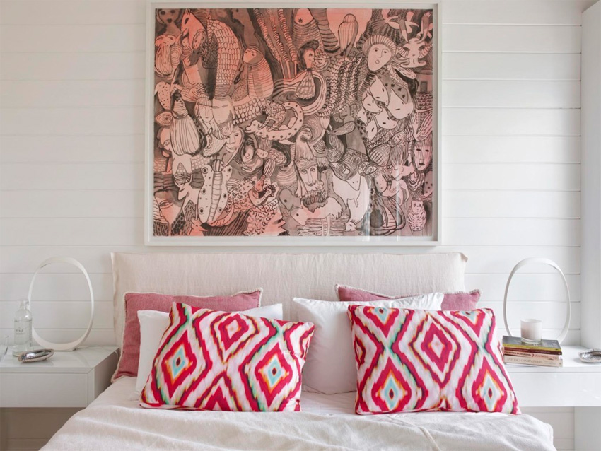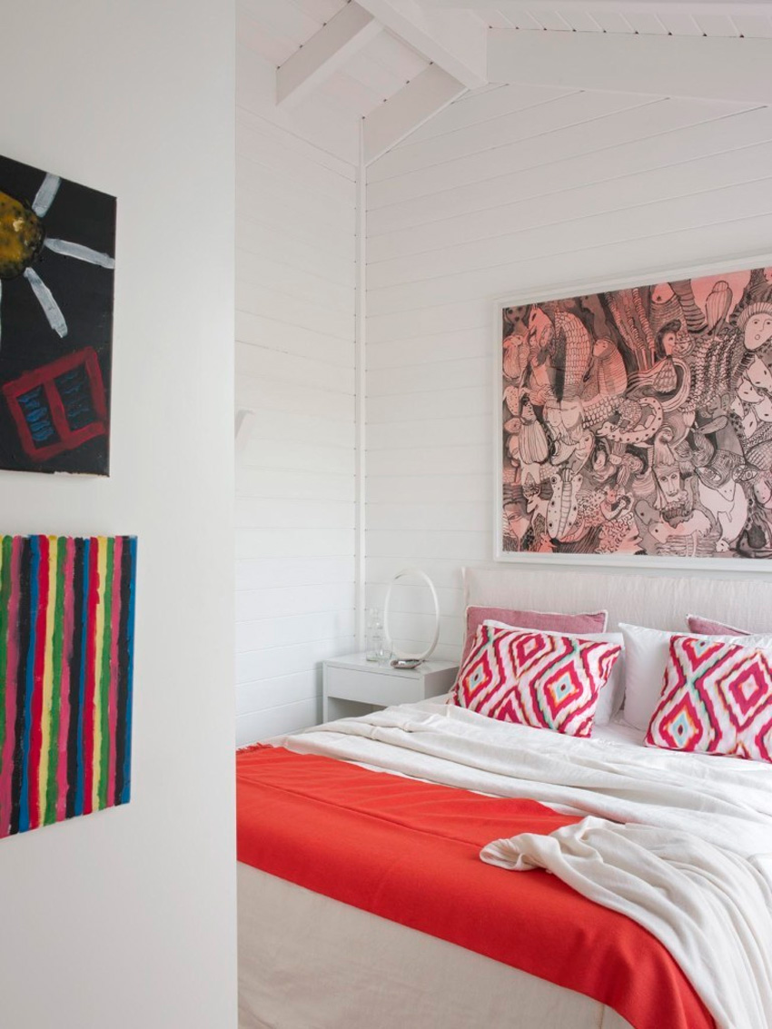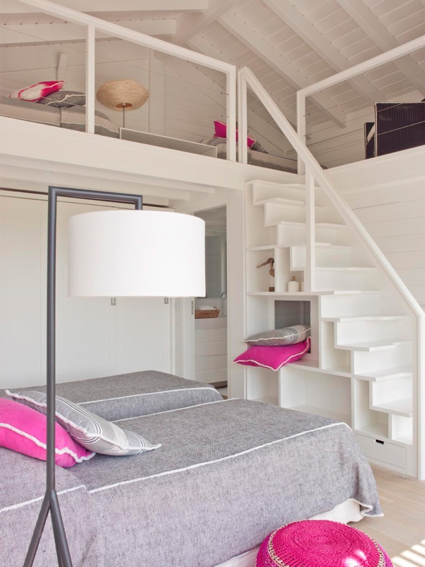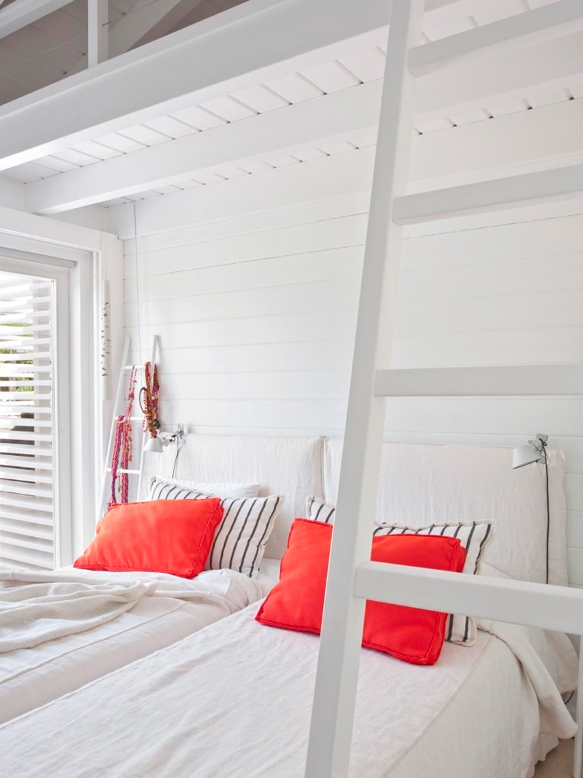 En el interior, la decoración quiere de cierto modo romper con el tradicional esquema cromático «azul marinero» de las casas de playa. Aquí las interioristas apuestan por una paleta de colores neutros contrastado con colores fuertes, como el atrevido rojo y fuscia. Estos colores funcionan muy bien, cuándo los aplicamos en pequeños detalles, de este modo damos personalidad al ambiente pero no restamos amplitud y luminosidad al espacio.