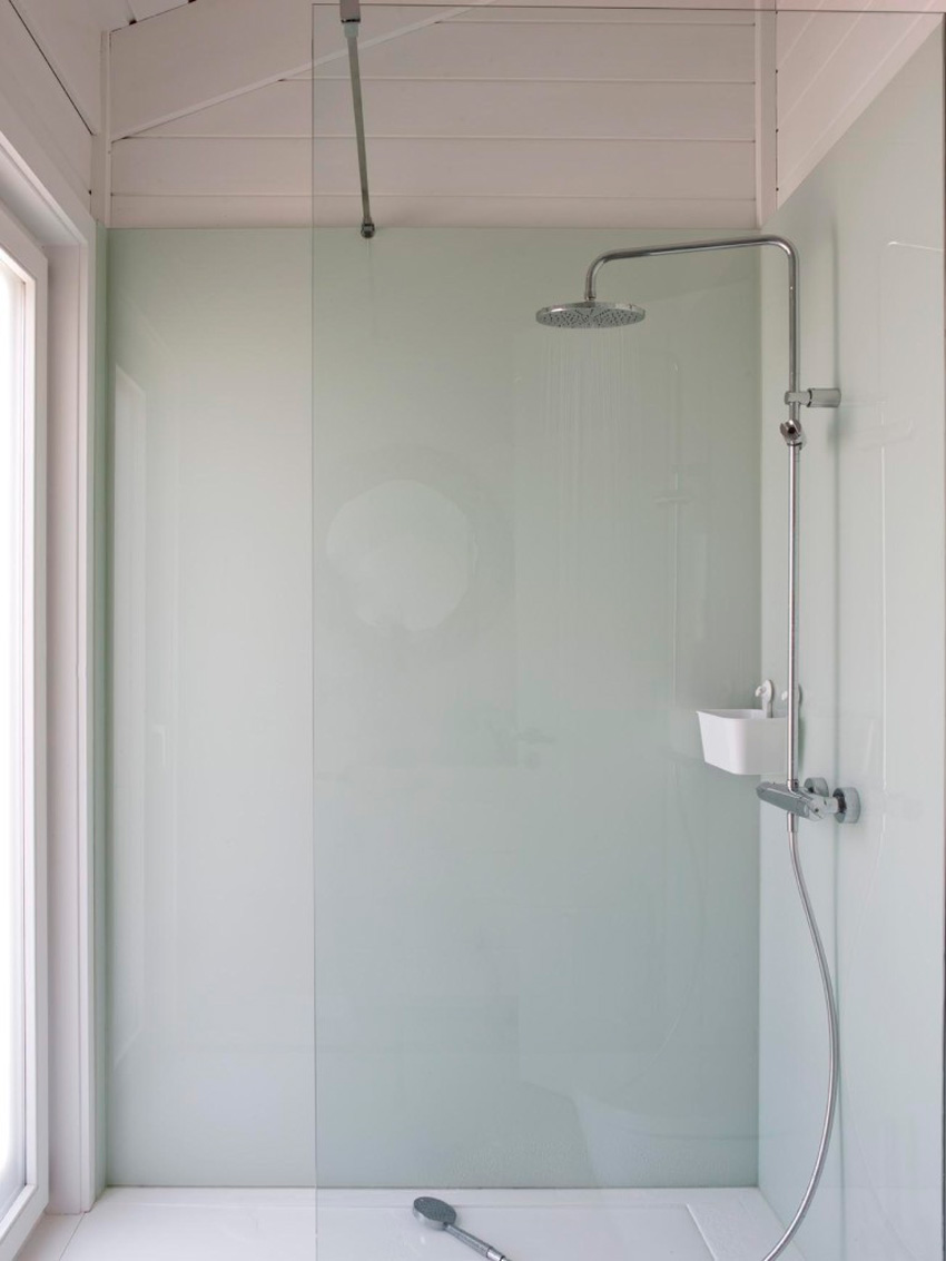 Desde el exterior ya se hace muy atractiva. Se asemeja más bien a una cabaña de madera que sorprende no sólo por sus líneas sencillas sino por el color azul cielo de los tabiques que contrastan con el blanco de las ventanas.